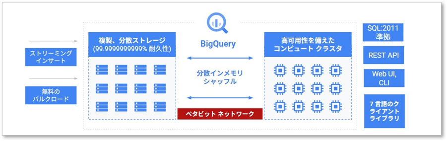 分析対象のデータは、Googleの大規模分散ファイルシステム「Colossus(コロッサス)」で管理されています。これにより、テラバイトやペタバイトといった巨大なデータでも、高い信頼性と柔軟な拡張性を両立させて保存・管理することが可能です