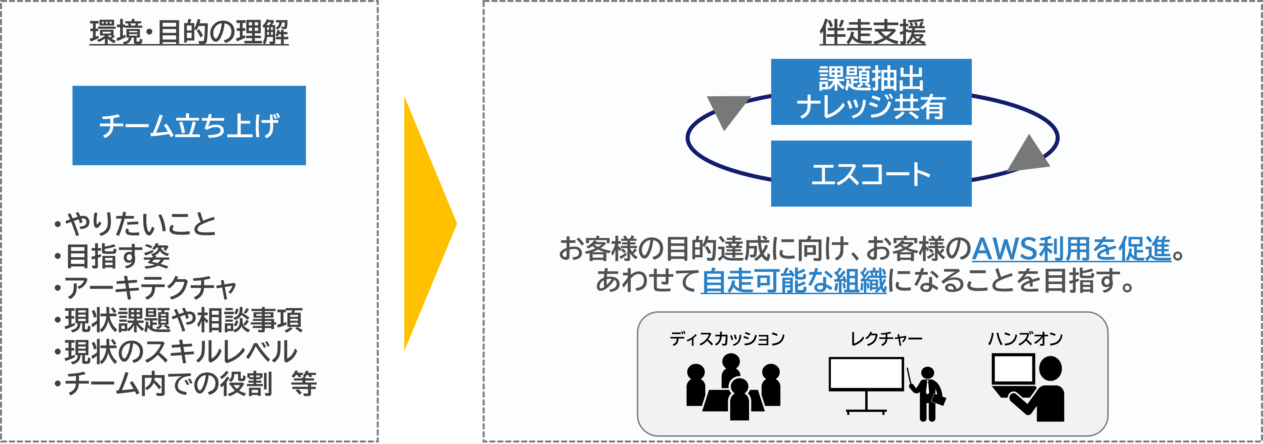 AWS導入検討段階から、アーキテクチャ設計レビュー、構築方法のレクチャー、運用改善、さらには生成AI活用まで、お客様の状況に応じて柔軟に支援・教育を行います。